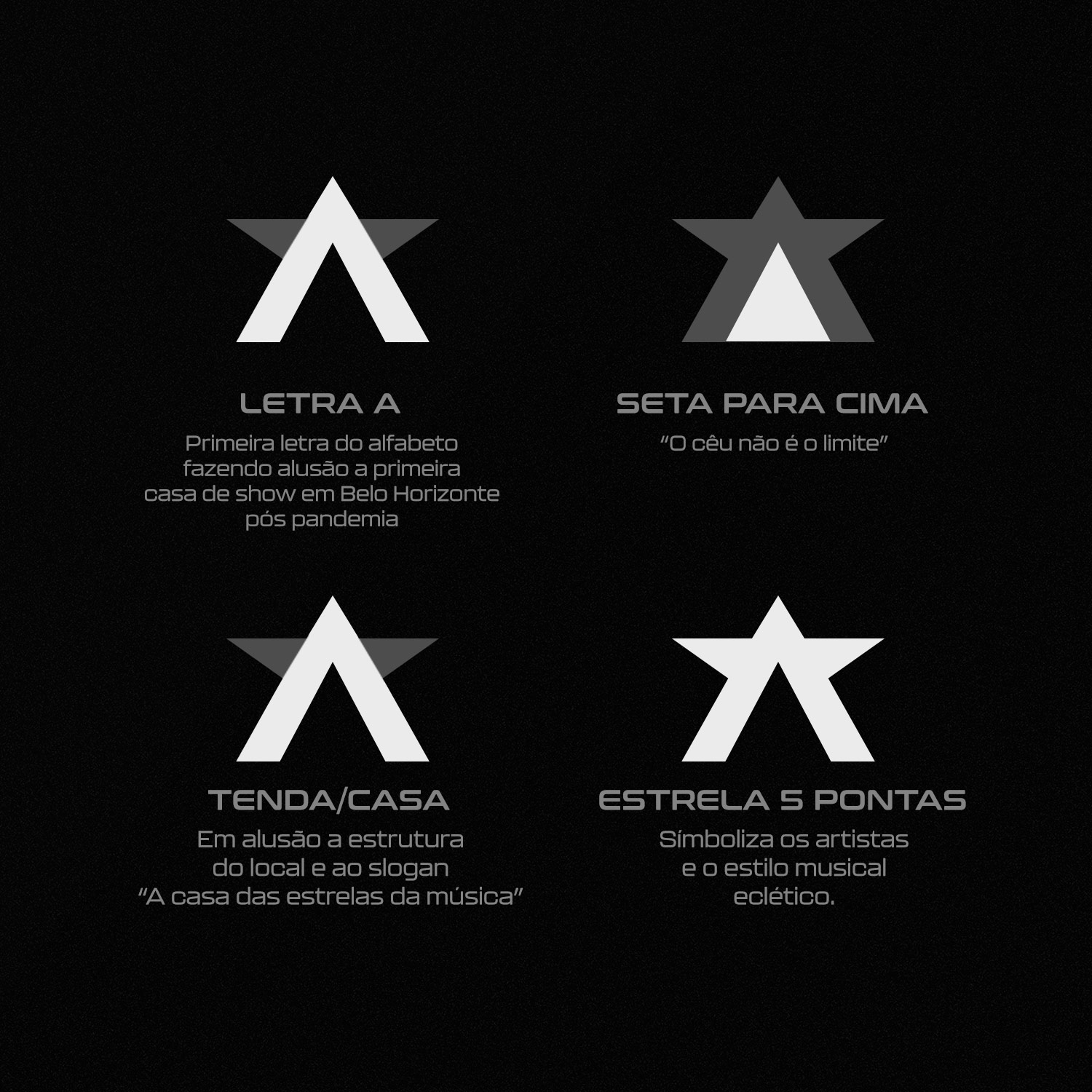 A letra A customizada em forma de estrela possui diversos significados, por ser a primeira letra do alfabeto representa a primeira casa de shows pós pandemia na região de Belo Horizonte, a forma de seta para cima representa que o céu não é o limite assim como a casa de shows não possui limites de estilos musicais, também representa a forma de uma casa e o telhado que faz a alusão a tenda do local e assinatura e slogan que é “A casa das estrelas da música”,e por fim a estrela de 5 pontas representa a diversidade cultural, a diversidade do público, a diversidade musical e as diferentes gerações e lifestyles que lá irão estar reunidas para contemplar o show do seu artista predileto.